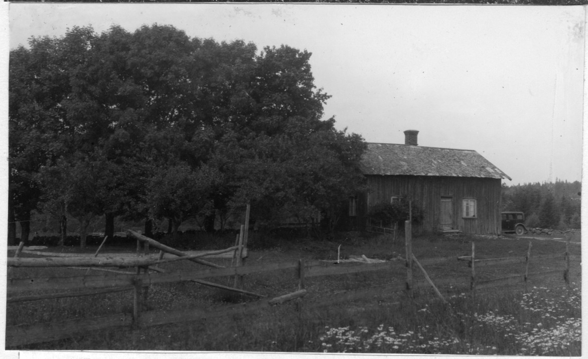 'Bildtext: ''Platsen för det gamla kronoskogvaktarebostället.'' Trähägnad framför träbyggnad invid träddunge. :: :: Fotonr. 7048:47-58 indelad under rubriken ''Skogsskötselns administration i Göteborgs och Bohus län''. Ingår i serie med fotonr. 7046:1-383, 7047:1-33 och 7048:1-67 med bilder från Länsjägmästare John Lindners bildarkiv.'