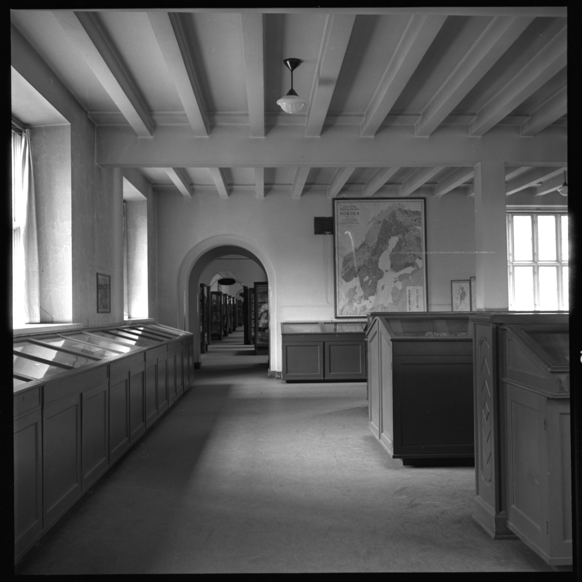 'Vy inifrån ''Vår jord'' avdelningen med geologiska avdelningen med låga monterskåp med bl.a. bergartssamling, mineralsamling. Vy rakt fram med gången med grod- och kräldjur främst. På väggen karta och till höger fönster samt i taket takbjälkar. :: :: Ingår i serie med fotonr. 7120 med diverse bilder från Hans Lohmander.'
