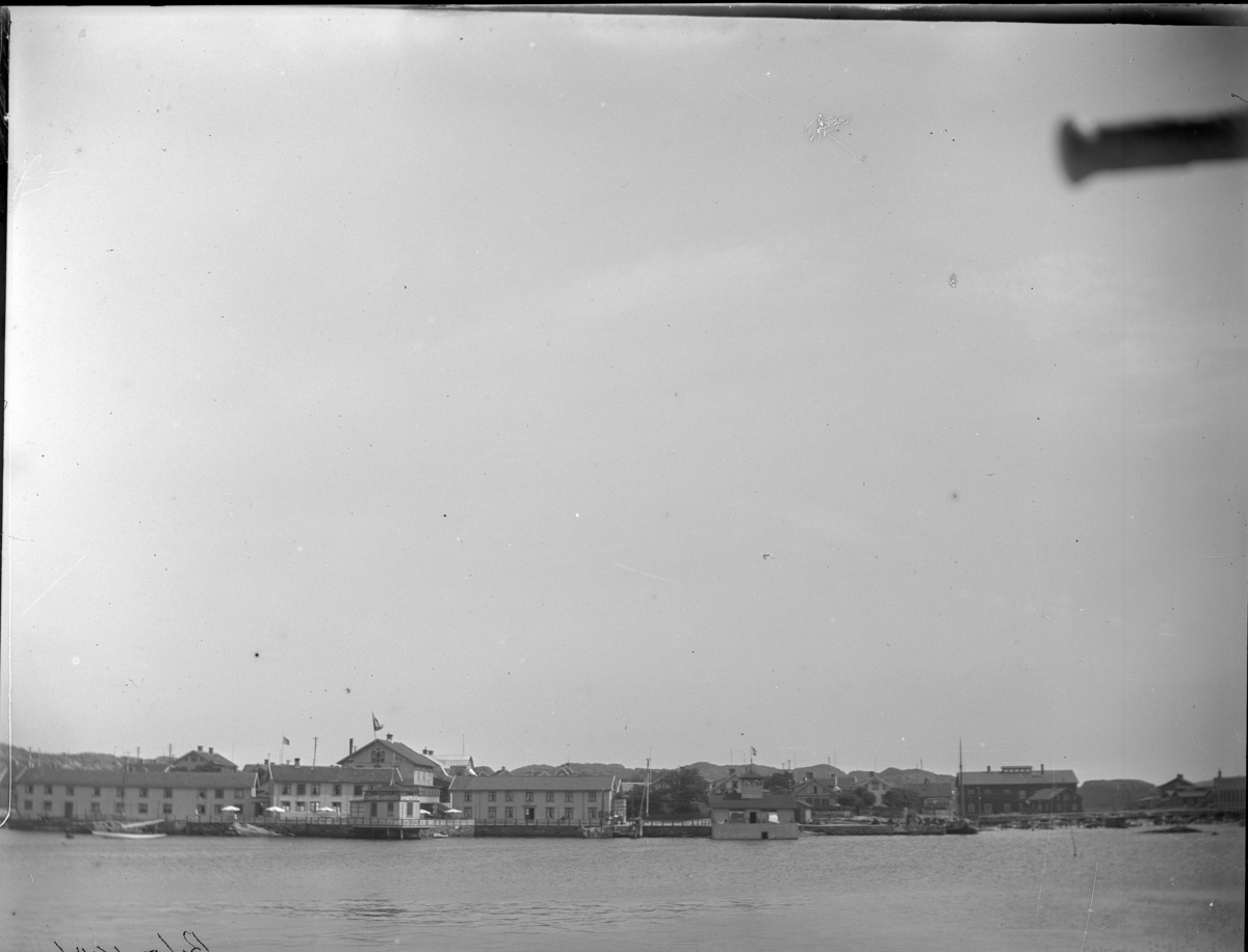 'Vy med stora hus, byggnader, text på ett hus ''Hotell Restaurang''. Vy in mot land från havet. :: :: Ingår i serie med fotonr. 5236:1-11.'