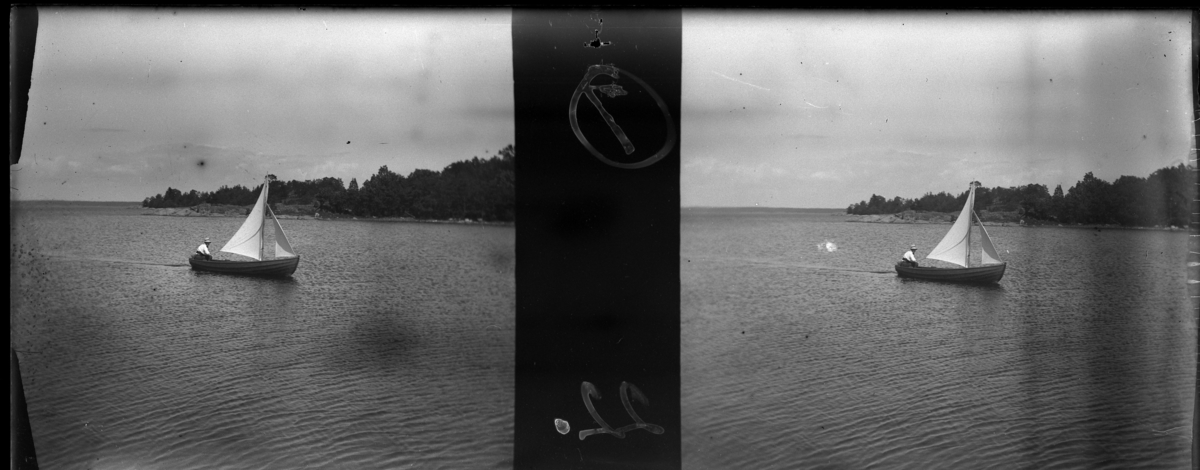 'Bildtext: ''Gösta L. seglande i sin båt.'' :: Vy med 1 man, Gösta Löfmarck, i segelbåt. :: :: Ingår i serie med fotonr. 5258:1-16. Se även hela serien med fotonr. 5237-5267.'