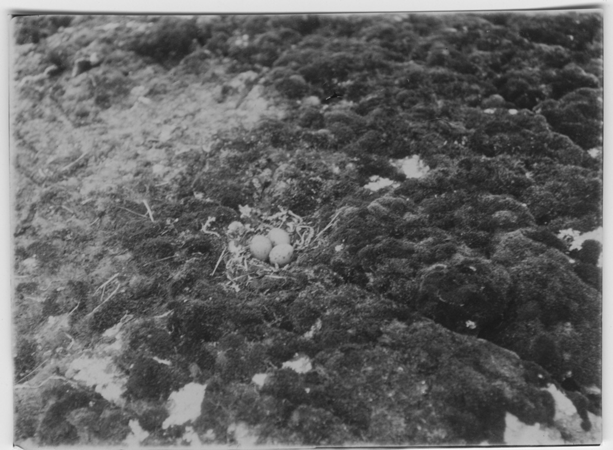 'Fisktärna, bo med 3 ägg. Enligt bildtext: Boet är byggt i mossan på berget, men förfärdigat av lösryckta och ditburna blommande stånd av Sedum acre, fetknopp, vilka finns rikligt på skäret. :: :: Ingår i serie med fotonr. 817-841.'