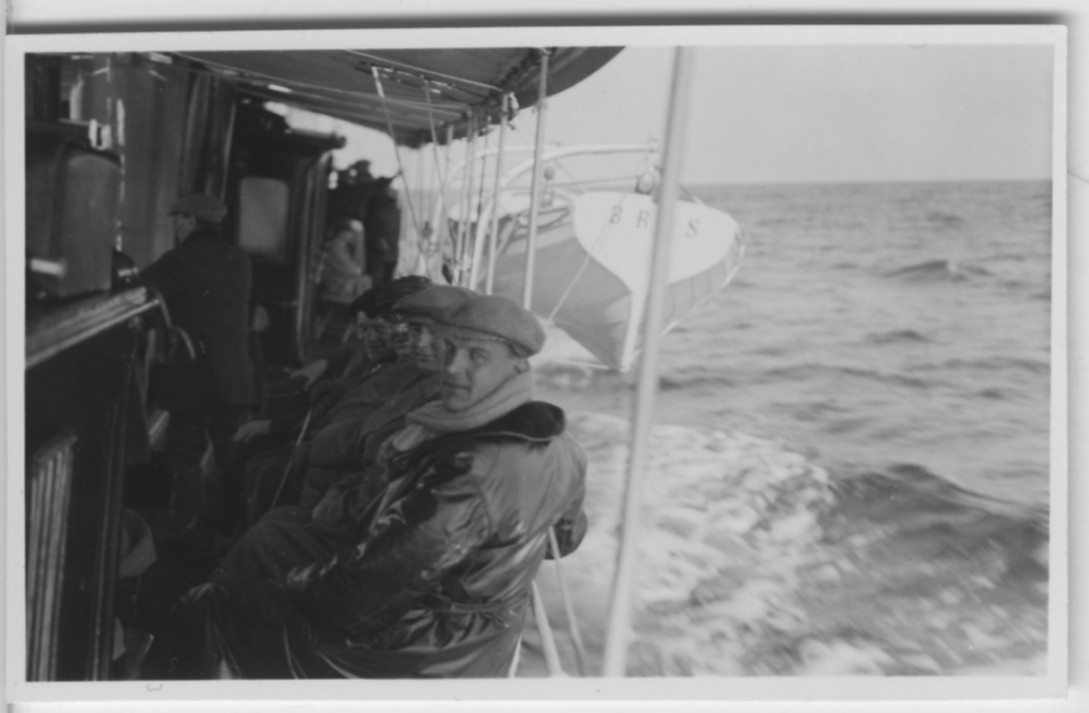'Biologiska föreningens utfärd till Läsö och Nordre Rönner: :: :: Ca 4 st män sitter längs relingen på båten ''BRIS''. :: :: Se fotonr. 2674-2734, 2687-2691, 2692-2711, 2714-2734, 2843-2863 och 2975 från samma utfärd.'