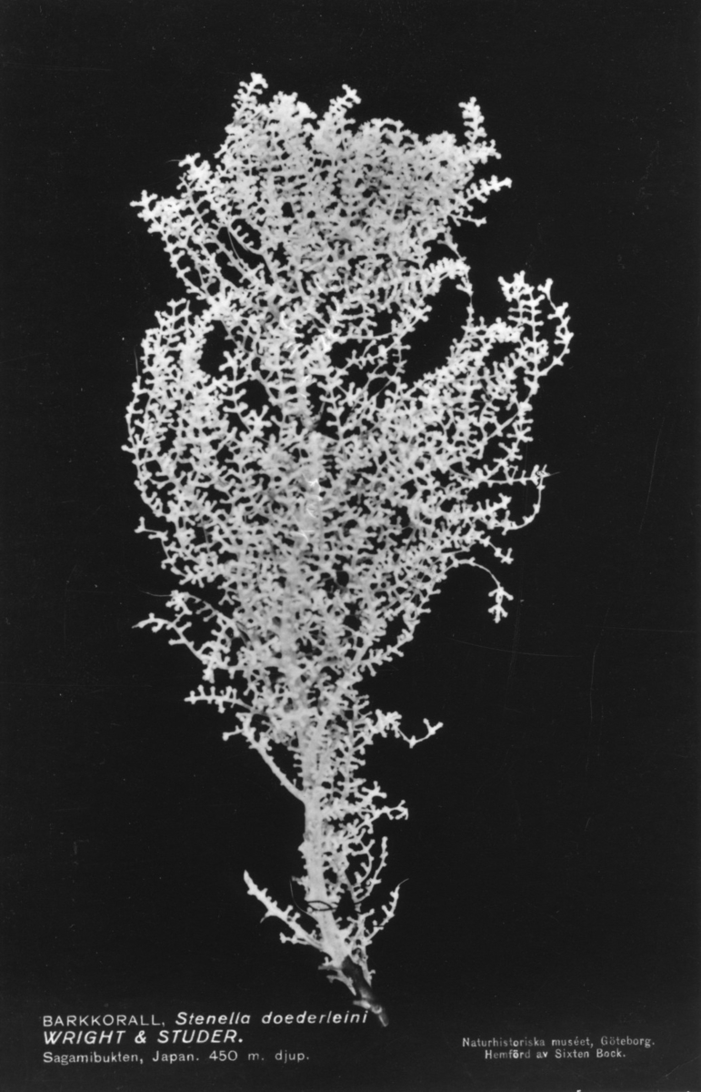 'Ingår i en serie med Fotonr. 5419 med Göteborgs Naturhistoriska museums olika vykort genom åren. :: :: Barkkorall från Agamibukten i japan som hemfördes till Naturhistoriska museet i Göteborg av Sixten Bock. Tryckt på baksidan: ''Naturhistoriska Museet, Gothenburg 11, Sweden...19...Dear sir, We have the great pleasure of thanking you for your kindness to send us...'