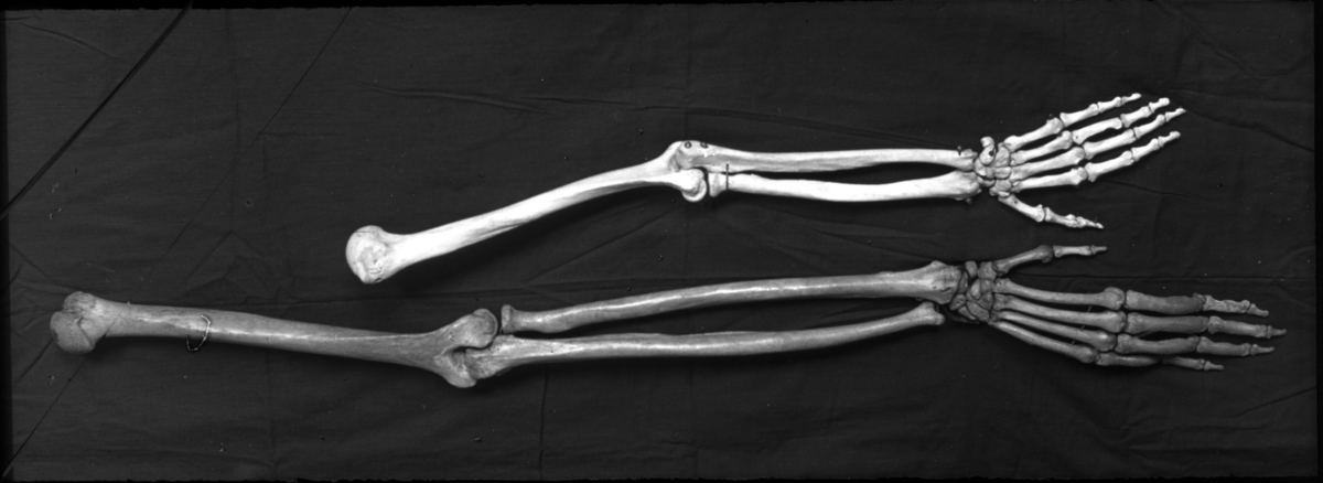 'Bildtext: ''Simia satyrus, Homo sapiens (pollices). 2 skelettdelar, armar från orangutang och människa. Bilden numrerad II.A. Nr. 10. :: :: Ingår i serie med fotonr. 5376:1-20, bilder från Dr. Schlüter & Mass naturvetenskapliga läromedel, Halle a S. Serie II.A. Nr 1-20. Se även hela fotoserien 5374-5376.'