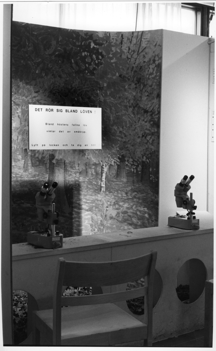'Foto på Jubileumsutställningen, Göteborgs Naturhistoriska museum 150 år. :: :: Interaktiv besöksdel med mikroskop. ''Det rör sig bland löven!'' I förgrunden, en stol.'