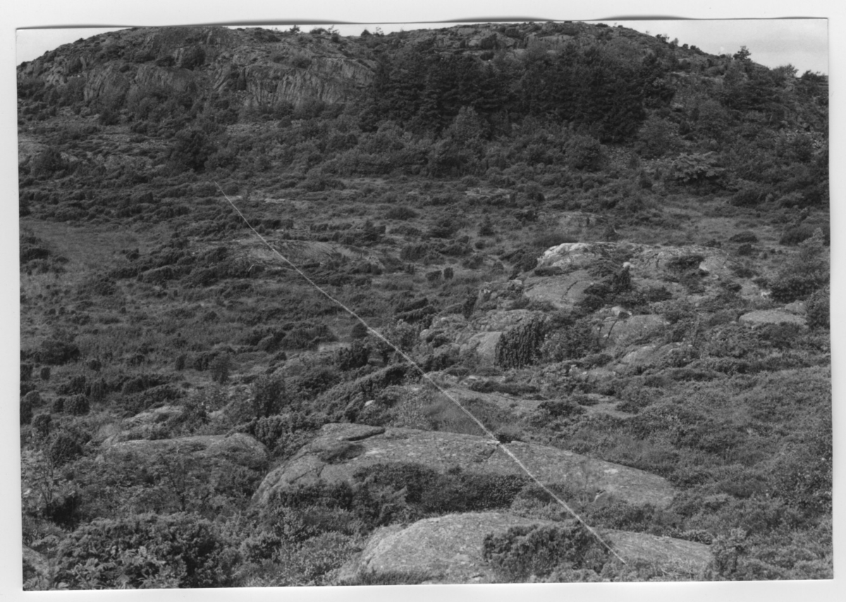 'Bildtext: ''Hällparti. Riktning 290.'' Vy ner mot lägre parti. Vy med enbuskar på berghäll. På avstånd en dunge med granar. :: :: Ingår i serie med fotonr. 6970:1-1125, dokumentation av Hisingens naturgeografi, visande landskapsformerna i stora drag och gjord inför exploateringen av området. Platserna för fotograferingen finns utsatta på karta i skala 1:4000 som finns på Göteborgs Naturhistoriska musem. Fotoriktningen mättes med kompass i gammalgrader.'