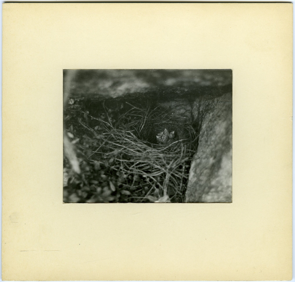 'Bildtext: ''Bo av nötskrika med sex ungar. Boet på marken, under en utskjutande stenhäll på Algotsbergets brantaste sluttning. (Unik placering. Nötskrikorna bygger nästan undantagslöst i träd).'' :: Närbild på 6 ungar i boet. :: :: Ingår i serie med fotonr. 7083:1-55.'