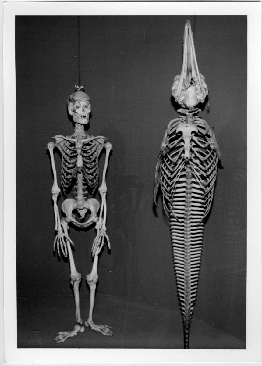 '2 skelett intill varandra, av människa resp. en val. Del av ''Valutställningen''. :: :: (Se även ev. fotonr. 6765, bilder från valutställningen, dessa kan höra ihop med detta fotonr.) :: :: Ingår i serie med fotonr. 7088:1-18.'
