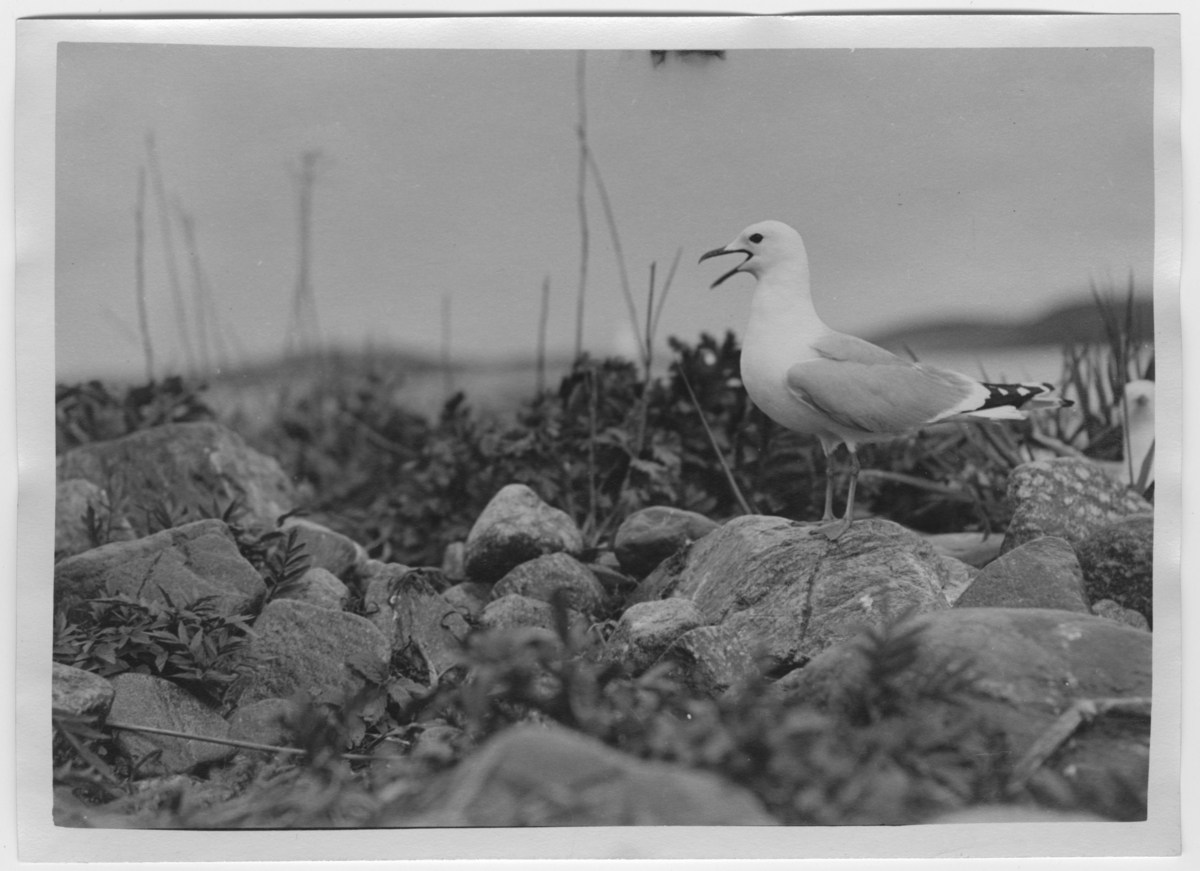 'Fiskmås på stenblock, sedd snett från sidan. :: :: Ingår i serie med fotonr. 2462-2487.'