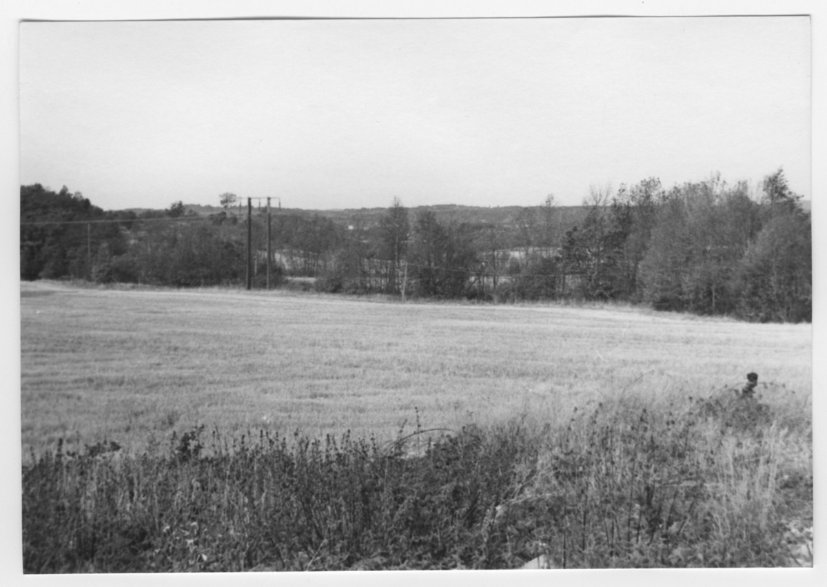 'Bildtext: ''Sedimentyta. Riktning 296.'' Vy över öppet fält, åker med elledning. Fält avdelade med trädvegetation ev. längs vattendrag eller stenmur. Stengärdesgård. :: :: Ingår i serie med fotonr. 6970:1-1125, dokumentation av Hisingens naturgeografi, visande landskapsformerna i stora drag och gjord inför exploateringen av området. Platserna för fotograferingen finns utsatta på karta i skala 1:4000 som finns på Göteborgs Naturhistoriska musem. Fotoriktningen mättes med kompass i gammalgrader.'
