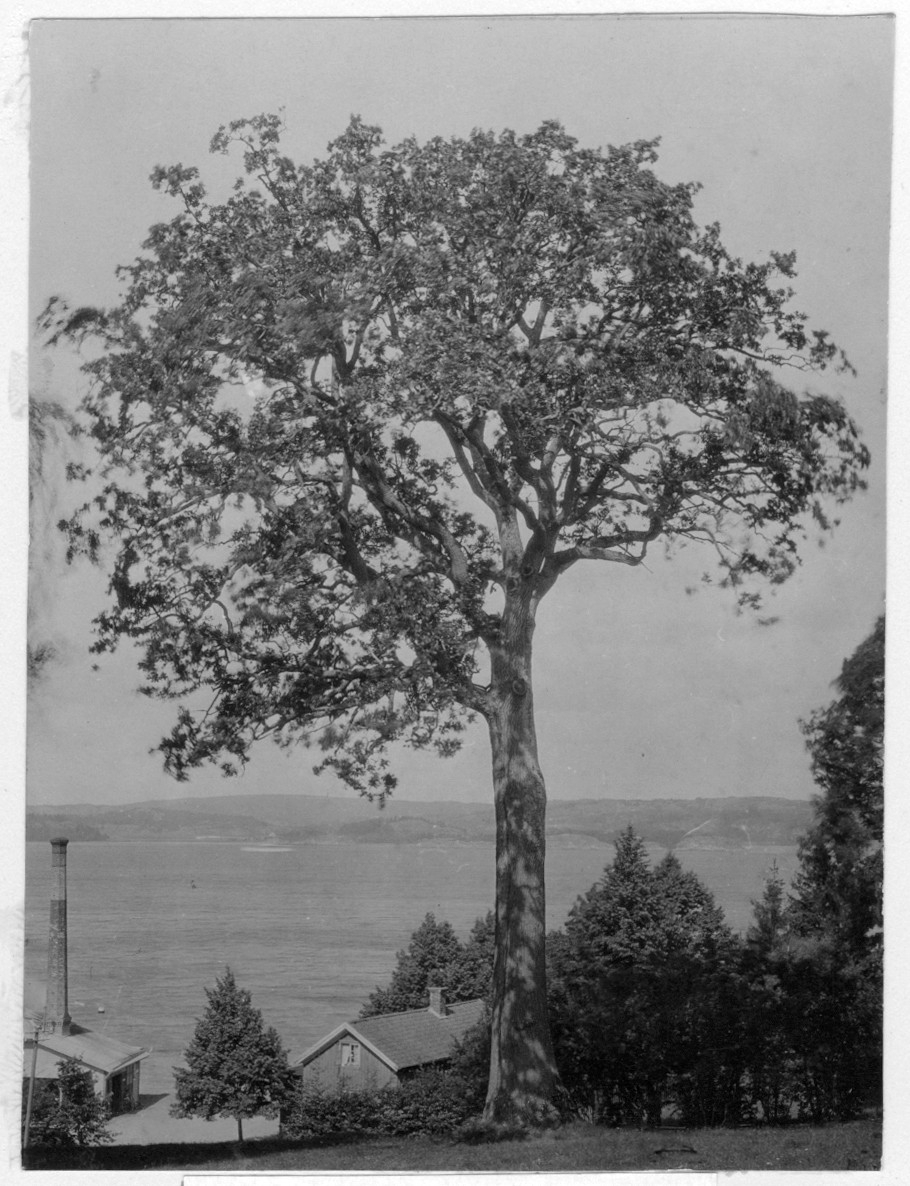 'Bildtext: ''Ek. '' Ek med hög stam, vy ut mot havet med hus i förgrunden. :: :: Fotonr. 7046:119-185 indelade som ''Märkvärdiga träd i Göteborgs län och Bohus län''. Ingår i serie med fotonr. 7046:1-383, 7047:1-33 och 7048:1-67 med bilder från Länsjägmästare John Lindners bildarkiv.'