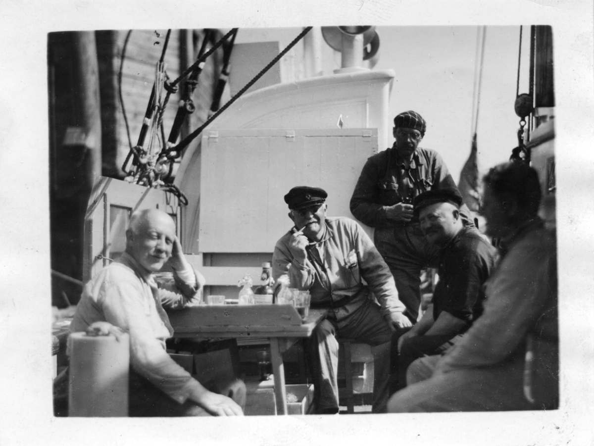'5 män ombord på båten ''Gunnerus''. Andre från vänster Leonard Axel Jägerskiöld och stående till höger om honom är Nils Odhner. Andre från höger sitter C. A. Aanderud. Sittande vid bord dukat med glas och glasflaskor. På bilden även man vid namn Carlson. :: :: Enligt text på baksidan av fotografiet: ''bvalskasjouren (?) keskgeer(?) C. A. Aanderud (andre från höger) på visit ombord 'Gunnerus', Carlsons, Jägerskiöld, Nils Odhner(?) ska senare bestyra såväl i Norr som sydkustsvalfångst. J., som en sommar på 90-talet varit med, och Aanderud fann varandra helt.'' :: :: Senare tillägg: ''Sune Swärd längst t. höger.'' :: :: Ingår i serie med fotonr. 3679-3693 se även 3694-3719.'