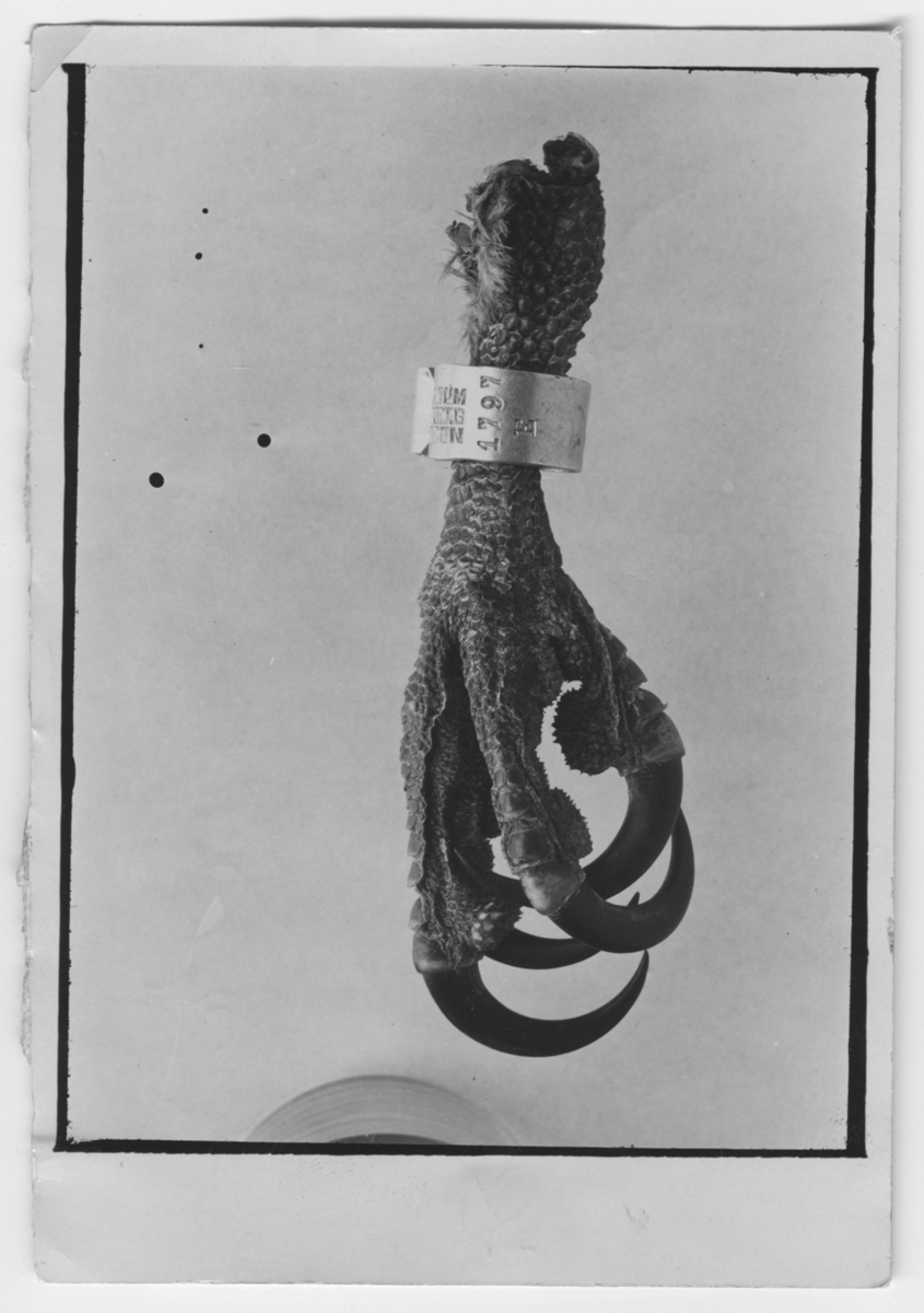 Fot av fiskgjuse, ringmärkt 1797 E. På en lapp tillhörande fotot står: Pandion haliaetus (Linnaeus), Ångermanland 1930-07-18, återfunnen Alfaqnes, Östra Spanien 1930-10-25.