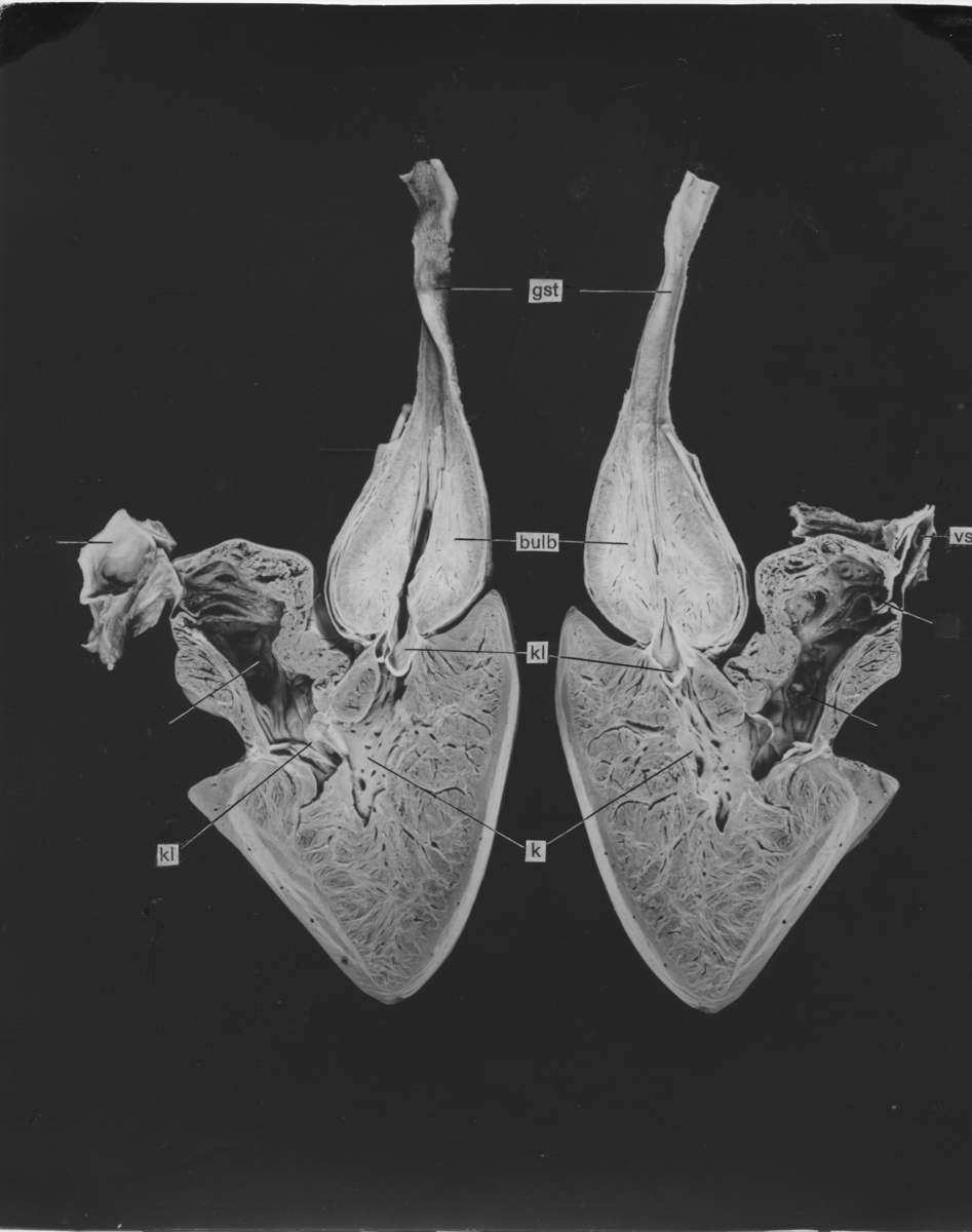 'Sagittalsnitt av hjärta hos tonfisk. Organets delar utmärkta med, gst, bulb, kl, k, samt vs. :: :: Ingår i serie med fotonr. 4177-4184.'