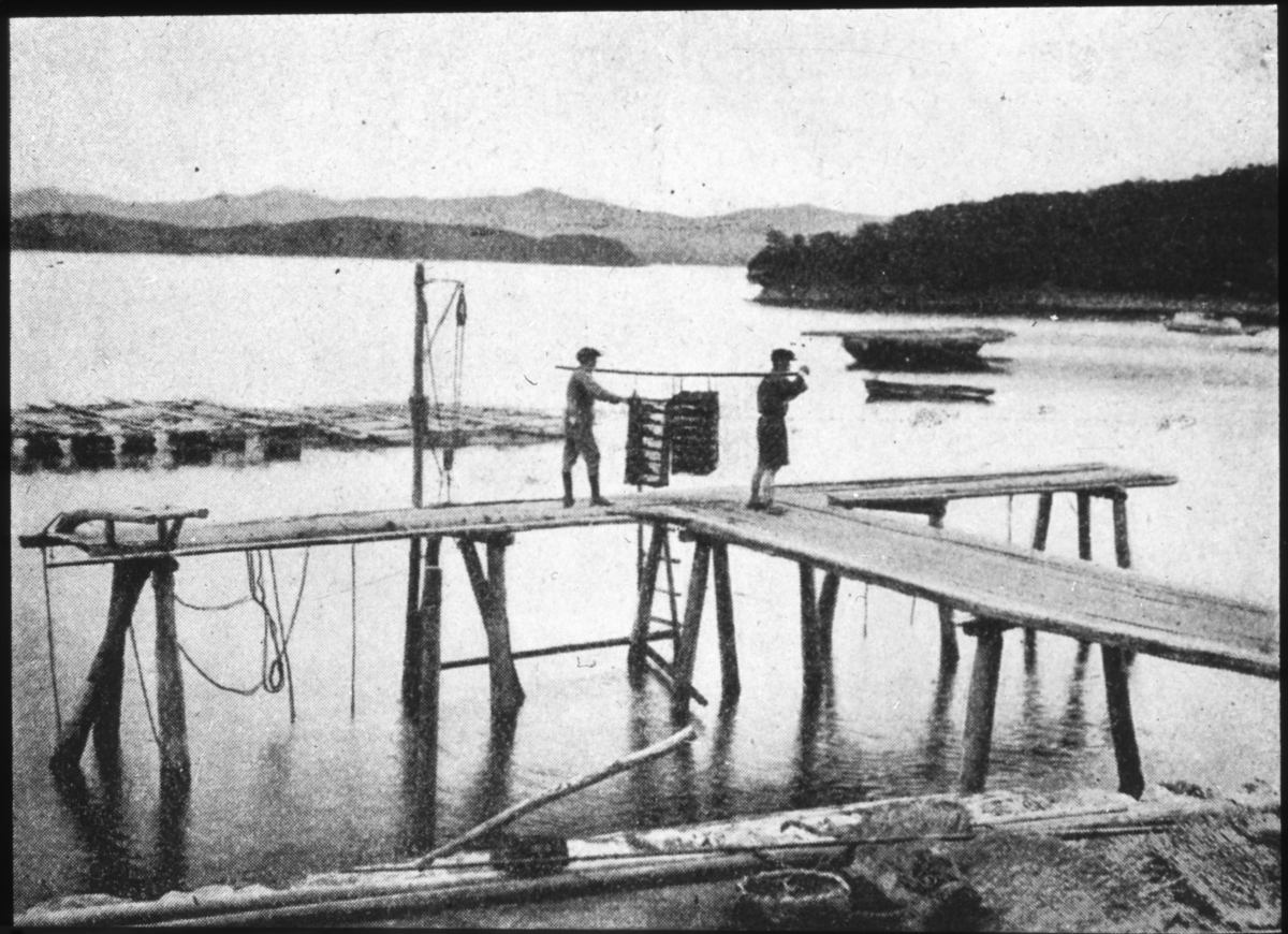 'Bildtext: ''Anläggning för framställning av japanpärlor vid japans östkust.'' :: 2 personer bär på en stång med behållare, på brygga. Vy ut mot havet. :: :: Ingår i serie med fotonr. 5118:1-6.'