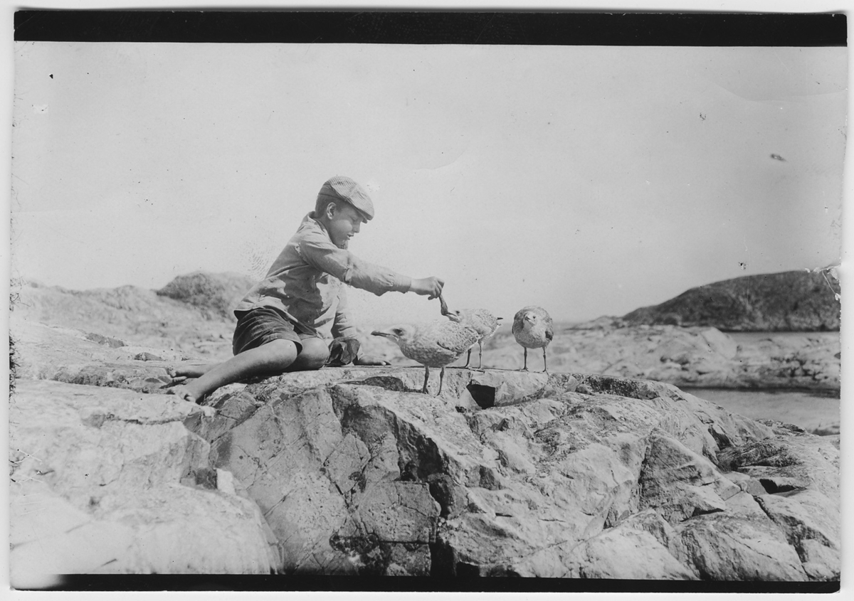 '3 st havstrutungar och 1 pojke sitter på berghäll och matar dem. Bildtext: ''De tama havstrutungarna, 5 veckor gamla''. :: :: Se serie med fotonr. 468-475.'