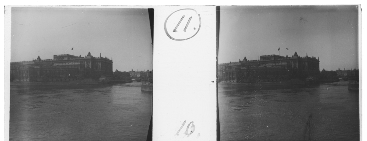 'Vy av riksdagshuset med vatten i förgrunden. :: Enligt text till fotot: ''Riksdagshuset, from Vasabron.'' (Riksadgshuset sett från Vasabron.) :: :: Ingår i serie med fotonr. 5246:1-17, se även hela serien med fotonr. 5237-5267.'