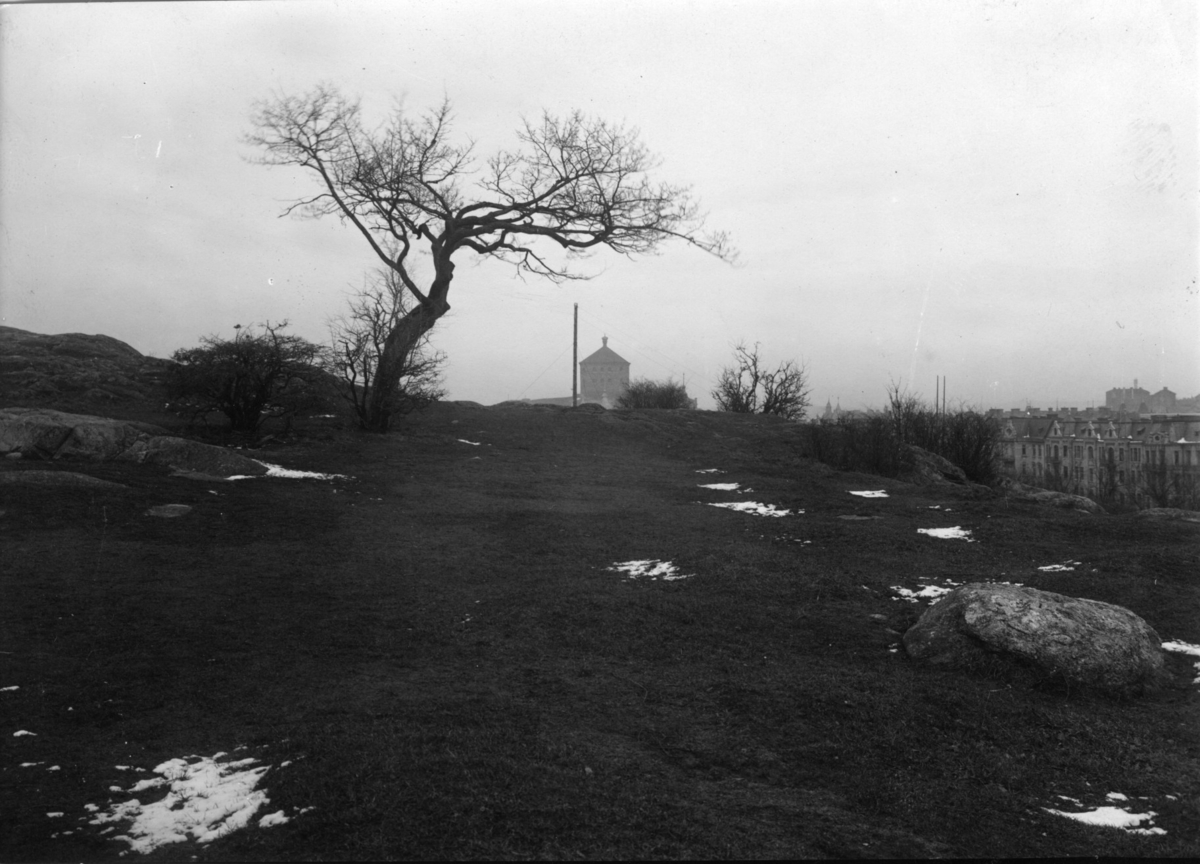 'Olivedalshöjden, platsen för Naturhistoriska museet i Slottsskogen. Ekebacken, kullen före byggandet. 1 st solitär ek. I fonden syns Skansen Kronan. :: :: Samma motiv fotonr. 5345:26.'