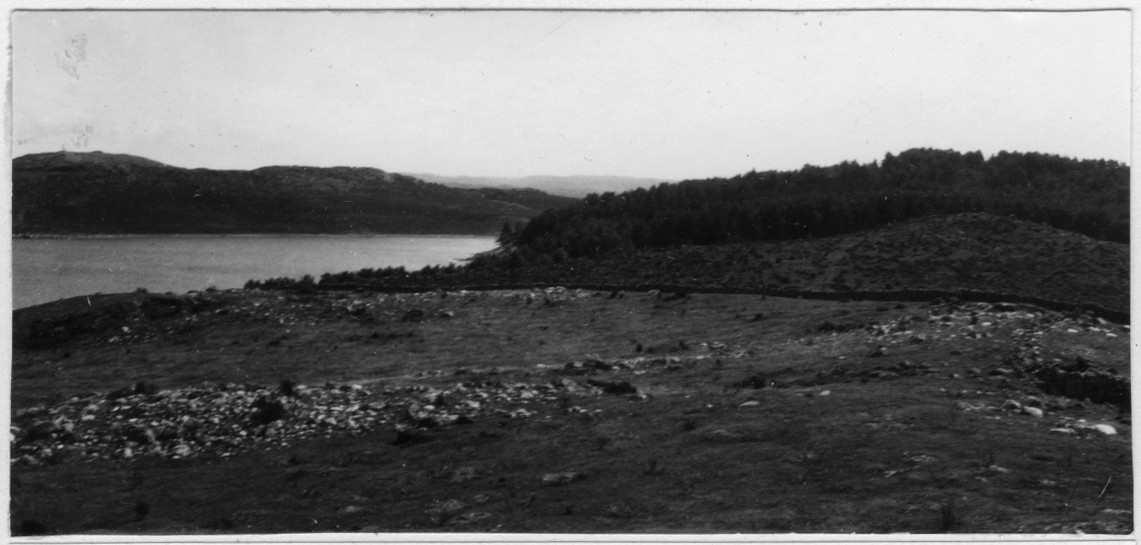 'Bildtext: ''I förgrunden betesmark, avbränd 1932. I mitten ljungmark. Bakgrunden 40-årigt, planterat tallbestånd.'' Vy över öppen ljungmark, hav och tallskog. :: :: Fotonr. 7048:1-26 indelad under rubriken ''Däggdjur, Människor''.'