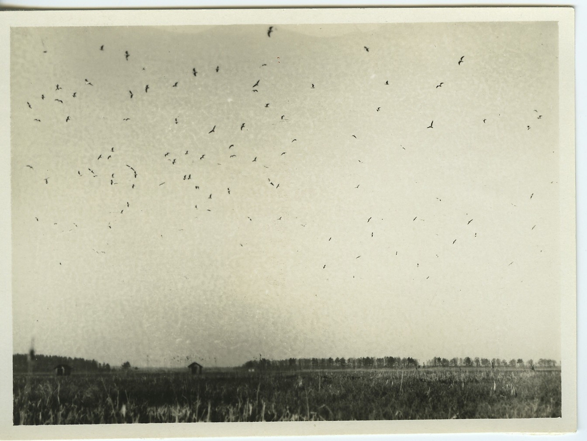 'Skrattmåsar flygande över Mälkölä-viken. Vy med 2 lador. Fågelmoln. :: :: Serie fotonr 953-971.'
