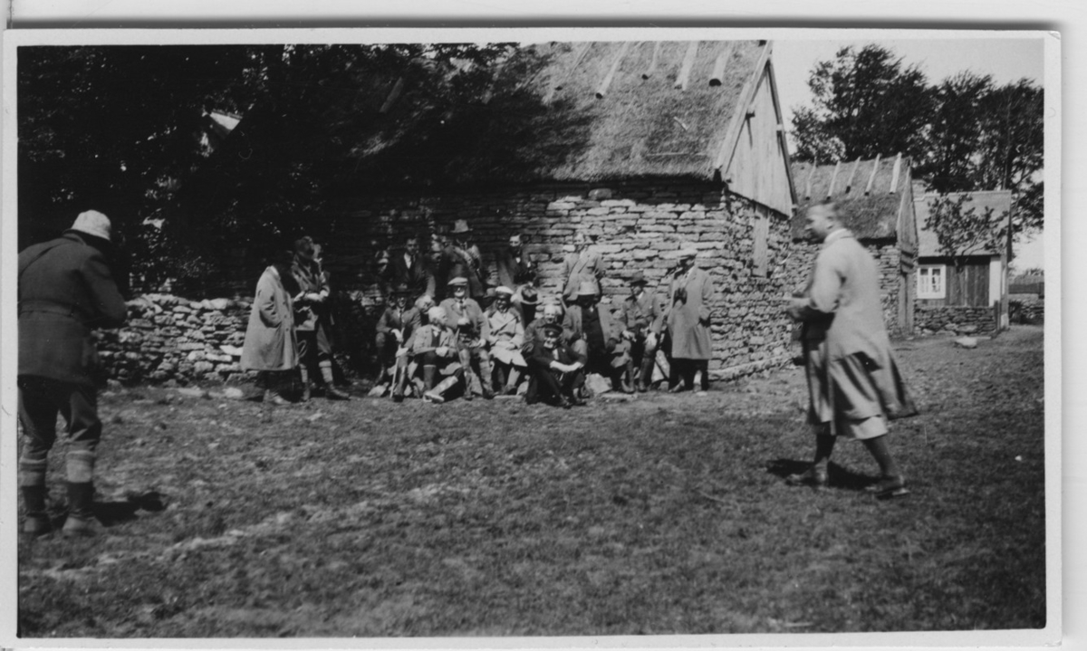 'Biologiska föreningens utfärd till Öland: :: :: Text enligt foto: ''Vilostund vid Petgärde.'' Gruppen, ca 16 st män, samlad framför stenvägg tillhörande gårdsbyggnad. :: :: Se även fotonr. 2607-2625, 2583-2606 samt 2883-2911 från samma utfärd.'
