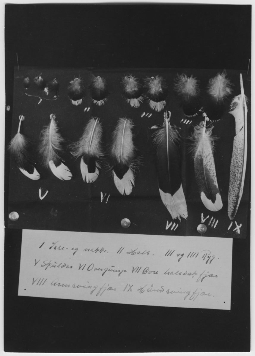16 fjädrar av dalripa liggande en och en på uppmarkerade platser (nr I- IX) med förklarande text under. Fjädrarna från olika delar av fågelkroppen.