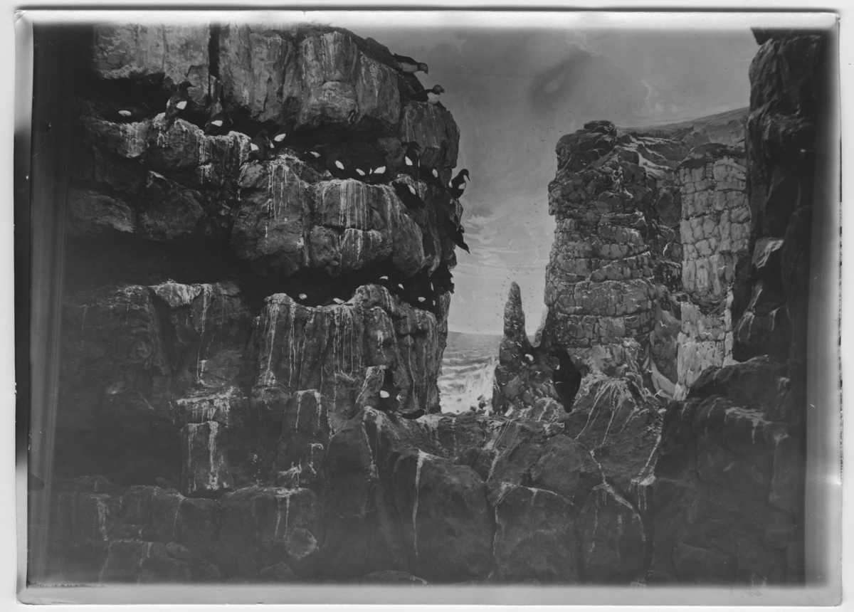 'Fågelberg med tobisgrissla (teistar, tejstar), lunnefåglar och tordmular :: :: Ingår i en serie fotonr. 3096-3108 med 12 st fotografier av dioramorna i Zoologiska museet i Berlin och fotonr. 3109-3120 med 12 st fotografier av dioramorna i Hermann-Roemer-museet, Hildesheim.'