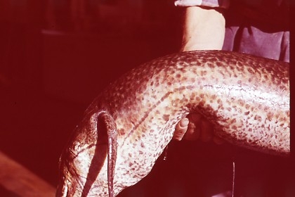 'Bilder en död lungfisk från akvariet. Avgjuten och placerad i basutställningen på Göteborgs Naturhistoriska museum, 1960. Avgjutningen gjord av Björn Wennerberg. :: :: En person håller i fisken, Mittendelen/huvudet av fisken fotograferad.'