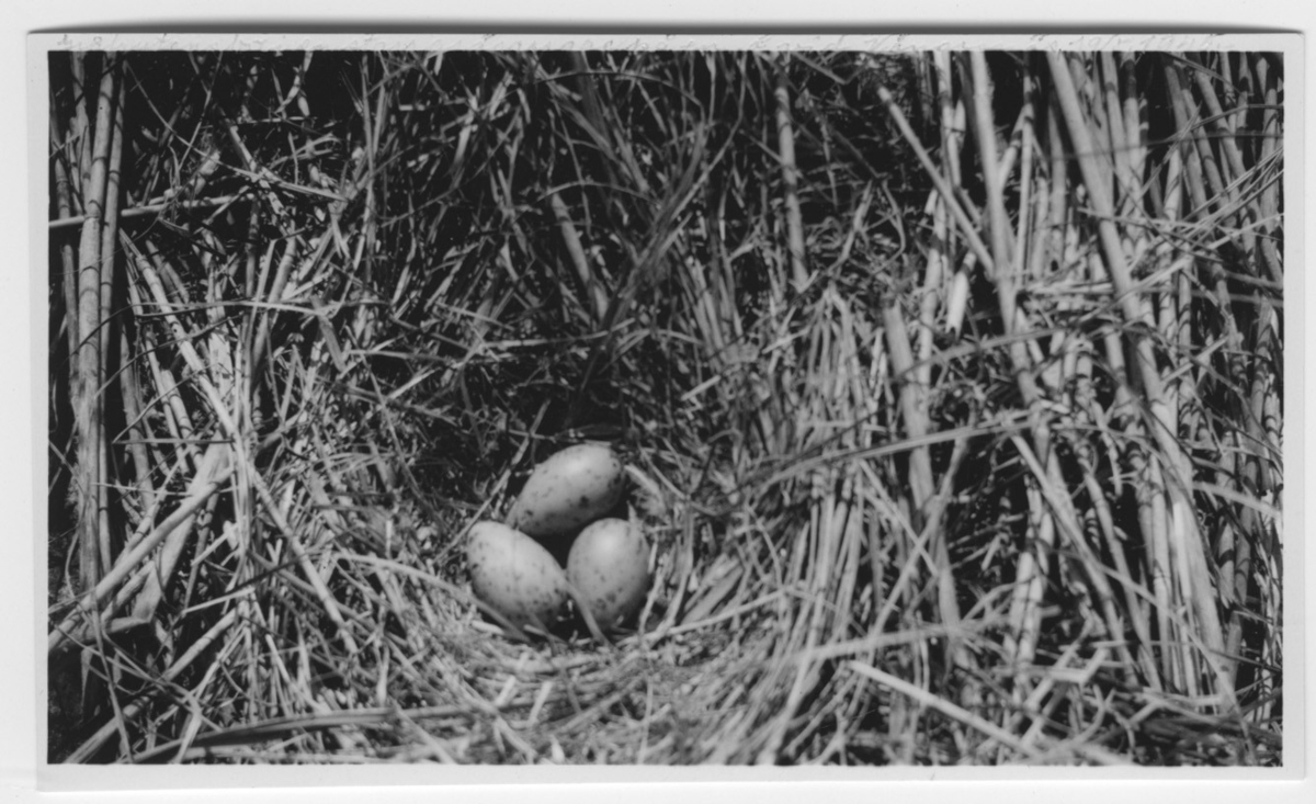 'Gråtrut, bo med 3 ägg. Text på fotot: ''Gråtrutens bo i en starrgräsrugge i en starrgräsrugge på en ö vid Vänersnäs.'' :: :: Ingår i serie med fotonr. 4140-4158.'