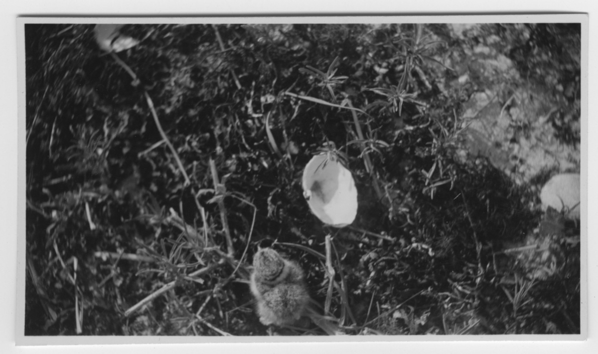 '1 st unge av strandpipare intill snäcka. :: :: Text på baksidan av fotot: ''Brodern eller systern till andre strandpiparungen trycker i tången invid en vit snäcka. Fotiot taget med 40 cm lins på en sandrevel.'' :: :: Ingår i serie med fotonr. 4500:1-172.'