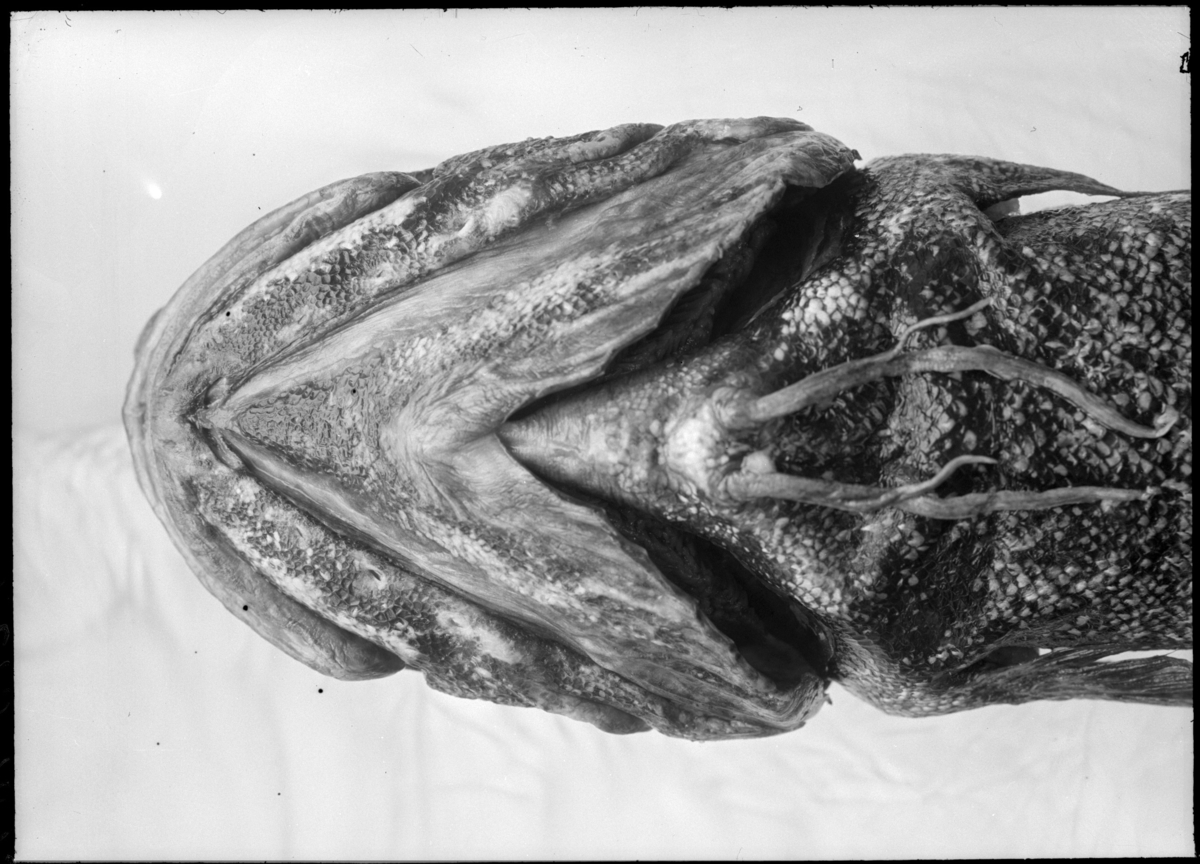 'Bassogigas crassus, huvudets undersida. :: Ur O. Nybelin: Fishes coll. by the ''Skagerrak''. Expedition etc. Pl. VI, fig 2.'