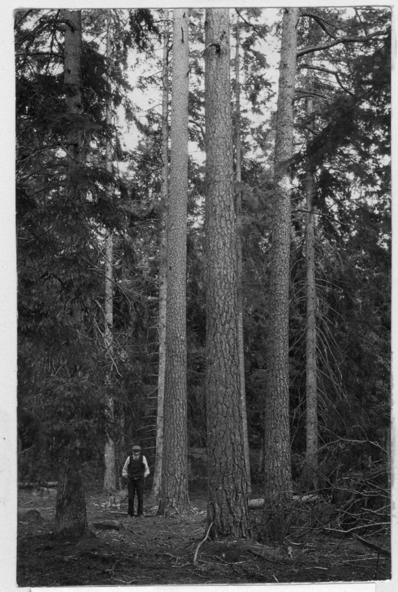 'Bildtext: ''Bild 132. 140-årig naturskog av tall och gran.'' 1 man stående invid stammar av gran och tall. Se även fotonr. 7046:246. :: :: Fotonr. 7046:234-275 indelade som ''Naturskogsbestånd i Göteborgs län och Bohus län''. Ingår i serie med fotonr. 7046:1-383, 7047:1-33 och 7048:1-67 med bilder från Länsjägmästare John Lindners bildarkiv.'