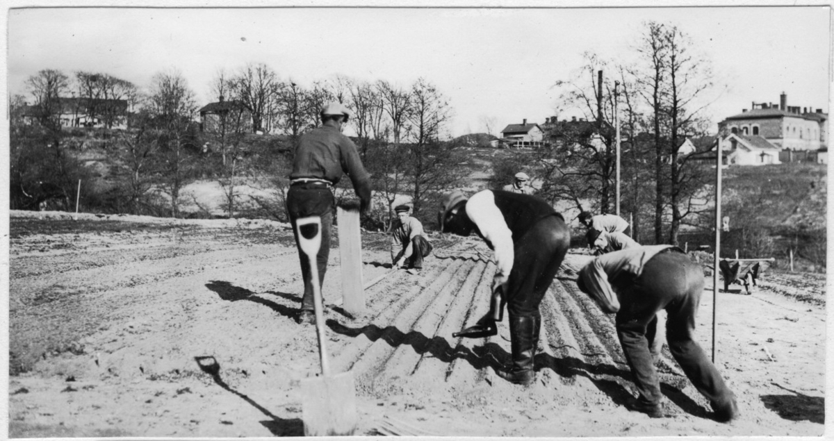 'Bildtext: ''Sådd av barrträdsfrö.'' ca 7 män arbetar med att så barrträdsfrön på ett fält. Spade, skottkärra framme. I bakgrunden byggnader och hus på kulle. :: :: Fotonr. 7046:307-328 indelade som ''Skogsodling och självsådd.'' Ingår i serie med fotonr. 7046:1-383, 7047:1-33 och 7048:1-67 med bilder från Länsjägmästare John Lindners bildarkiv.'