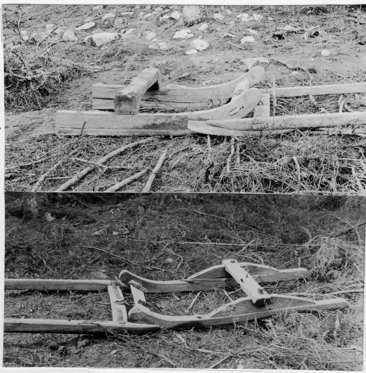 'Bildtext: ''Kälke för utsläpnig av timmer.'' 2 olika träkälkar som använts för att transportera timmer. :: :: Fotonr. 7046:335-353 indelade som ''Skogsavverkning och virkestransport.'' Ingår i serie med fotonr. 7046:1-383, 7047:1-33 och 7048:1-67 med bilder från Länsjägmästare John Lindners bildarkiv.'