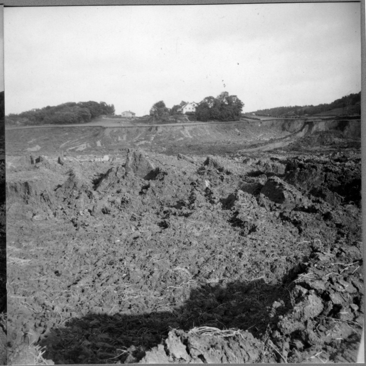 'Bildtext: ''Utsikt österut mot skredärret.'' Vy med skredpåverkad mark i förgrunden. I fonden syns hus och ev. allé. :: :: Ingår i serie med fotonr. 7052:1-19 med bilder bl.a. från Surteskredet.'