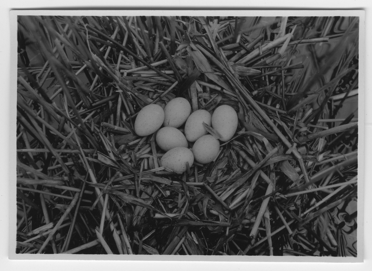 'Sothöna, bo med 7 ägg, närbild på boet i vass i vatten. Se även fotonr. 1333. :: :: Se serie med fotonr. 1305-1356.'