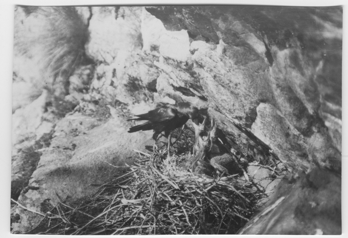 'Korpen matar sina ungar, bild med 3 st ungar och korp i boet. Samma motiv som fotonr. 2535. :: :: Ingår i serie med fotonr. 2524-2557.'