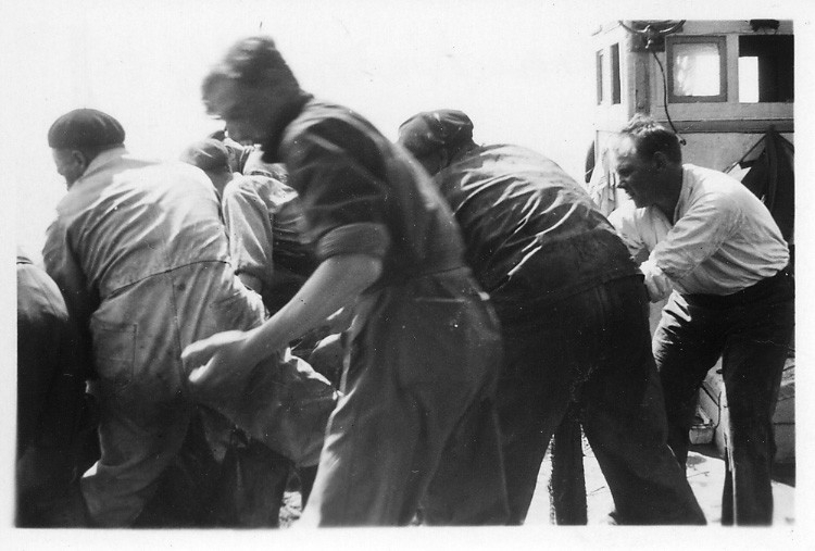 'Skandiaexpeditionen 1935: :: :: Ca 7 personer i arbete på båtdäck. Enligt anteckning på baksidan av fotografiet: ''Räktrålen halas ombord. De flesta jobbar för fullt.'' och ''Sune'' :: :: Ingår i serie med fotonr. 3441-3452.'