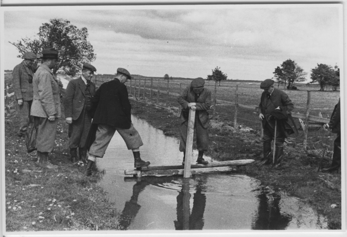 'Biologiska föreningens utfärd till Tåkern, Vadstena m.fl. platser: :: :: 7 män på väg över spång liggande över vattendrag alt. dike mellan betesmarker. Staket på båda sidor om vattnet. Även fotonr 3615. :: :: Se fotonr. 3588-3634 samt 3661-3677.'