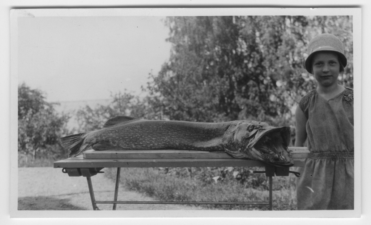 1 flicka står bredvid gädda liggande på träbänk (längd 143cm, vikt 10kg). I fonden träd och buskar.