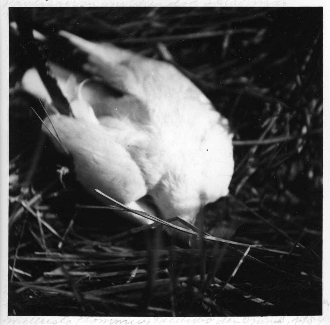 'Enligt anteckning på fotografiets baksida: :: ''Här ligger en nyligen död skrattmås mellan måsbona i den stora kolonien. Bilden togs på 33 cm avstånd orsaken till döden måste väl vara någon inre sjukdom.'' :: :: Ingår i en serie med fotonr. 4512:1-57 med diverse foton av fågelbon med ägg och ungar. Varje fotografi har utförliga anteckningar på sin baksida, kopierade från framsidan, spår av de på framsidan är fortfarande synliga.'