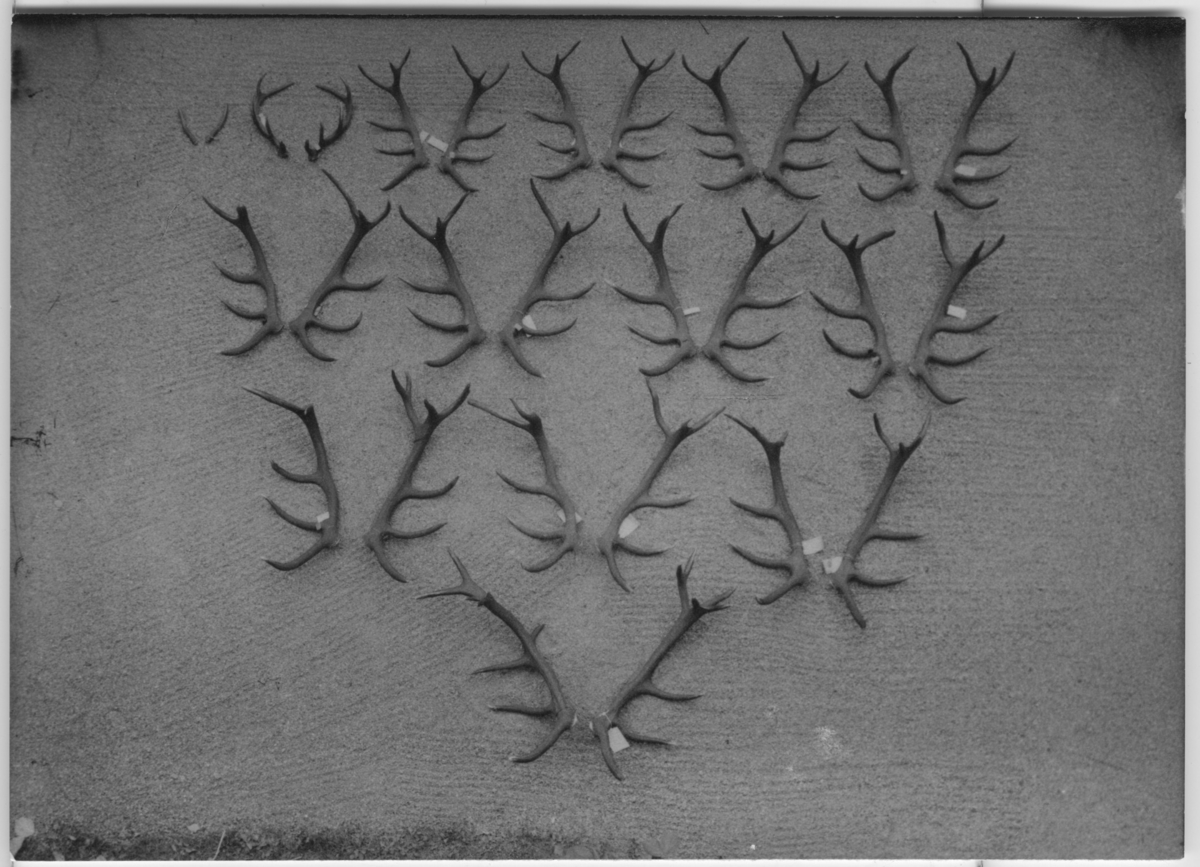 Fällhorn av Slottsskogens kronhjortar t.o.m 1947. 14 st snyggt utlagda på krattat grus.
