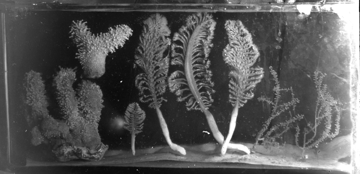 'Glasburk med diverse preparat av havspennor och koraller. Se även fotonr. 5139:34, samma motiv. :: :: Ingår i serie med fotonr. 5139:1-36. Fotonr. 5139:1-17 ligger i en ask med texten ''med motiv från (enligt pappasken) Helgoland. För diapositiv.'' Fotonr. 5139:18-27 ligger i en pappask med texten: ''Helgoland (''Augusta'')'' en del för diapositiv. Fotonr. 5139:28-36 ligger i en ask med texten ''Dubbletter från Helgoland. Dessutom diapositiv från Kristineberg och Lysekil.'''