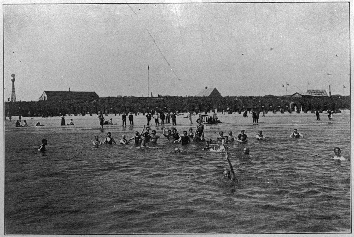 'Vy med badande människor, män och kvinnor. Vy in mot land med hus. Avfotograferat tryck. :: :: Ingår i serie med fotonr. 5137 med diverse bilder. Plåtarna ligger i 2 pappaskar. På asken för negativen 9x12 cm och 12x18 cm står texten: ''Fröken Pettersson, Eksjö. Kopieras. Negativ. Alingsås samskola? m.m.'''
