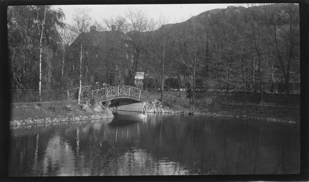 Fågeldammen med vacker bro. I bakgrunden skymtar stationshuset vid Säröbanan vid Linneplatsen. 2 personer på bron.