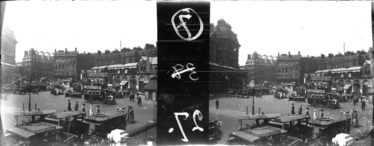 'Bildtext: ''Victoria station yard (Sunday).'' :: Gatuvy med bussar, människor och hus. Gatlykta. :: :: Ingår i serie med fotonr. 5263:1-16. Se även hela serien med fotonr. 5237-5267.'