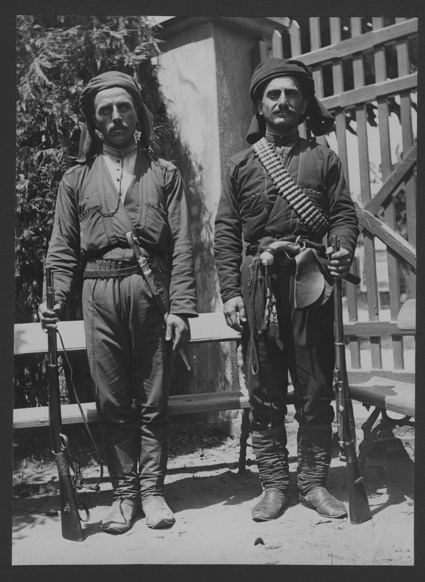 '2 män med gevär och patroner över bröstet. :: :: Se även hela fotonr. 5269-5292 med bilder från Stuxbergs resa till Kaukasien.'
