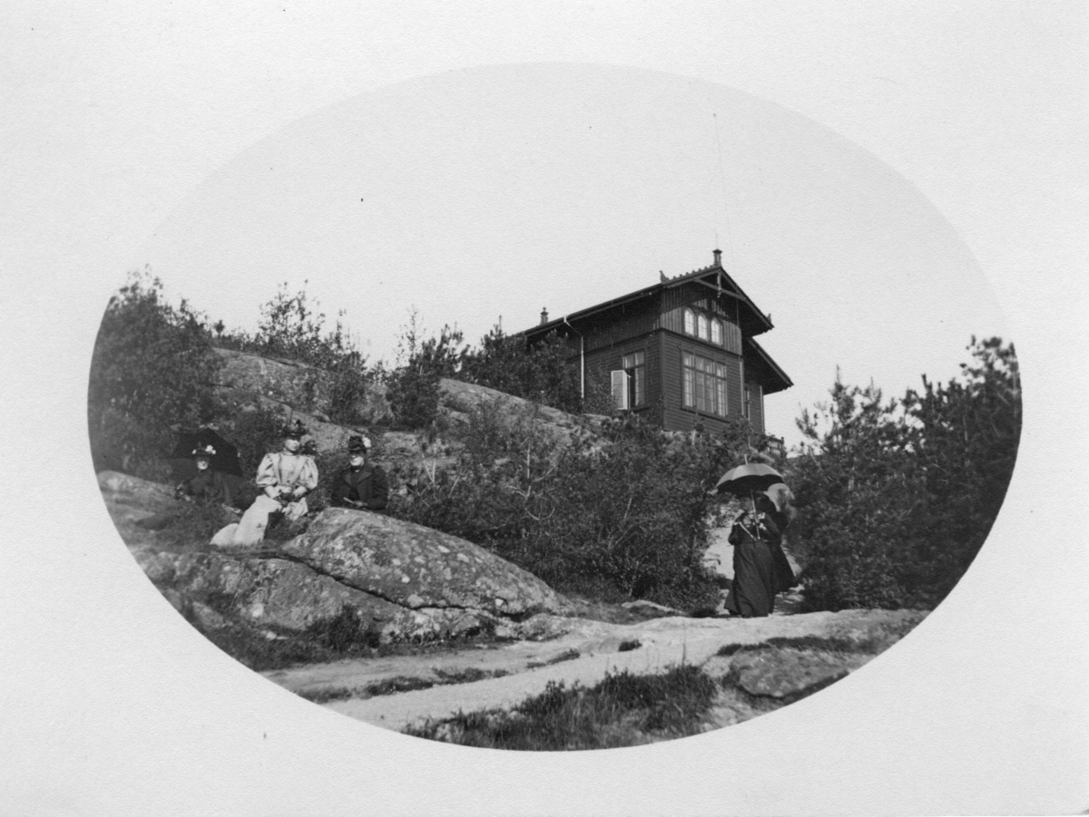 Bild upp mot trähus. 3 st personer (kvinnor) sittande på berghäll. 1 kvinna gående med paraply.
