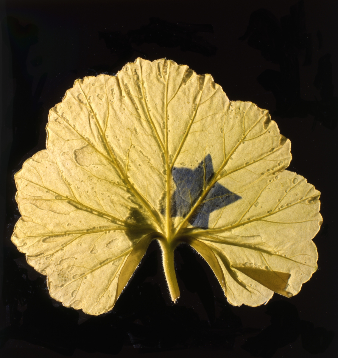 'Pelargonblad som varit täckt med alumniumfolie på hela bladet utom det som syns som en stjärna, här har fotosyntesen kunnat pågå. :: :: Ingår i en serie med fotonr 6127 med färgdia som användes i utställningen ''Gröna fabriken''.'