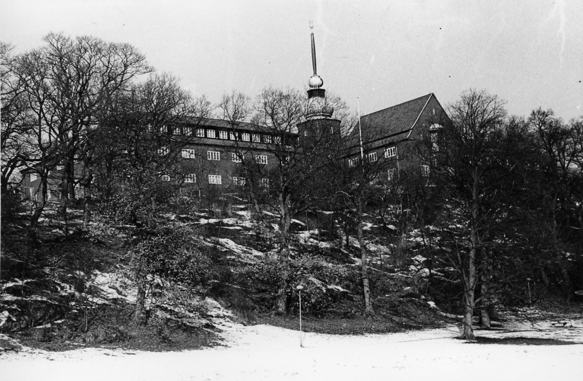 'Tillbyggnaden av Göteborgs Naturhistoriska Museum april 1979. Foto från Slottsskogen och upp mot Göteborgs Naturhistoriska Museums västra sida med tornbyggnaden. Snö., Naturbild, Byggnader :: :: Ingår i serie med fotonr. 5527:69-216.'
